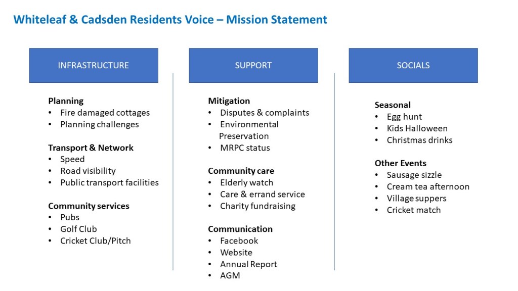 Whiteleaf and Cadsden Resident’s Association (WCRA) is a Community Interest Company (CIC) registration number 12540390. You can view our Certificate of Incorporation and our Memorandum of Association and Articles. The latter incorporates the WCRA Constitution which was agreed in 2017.