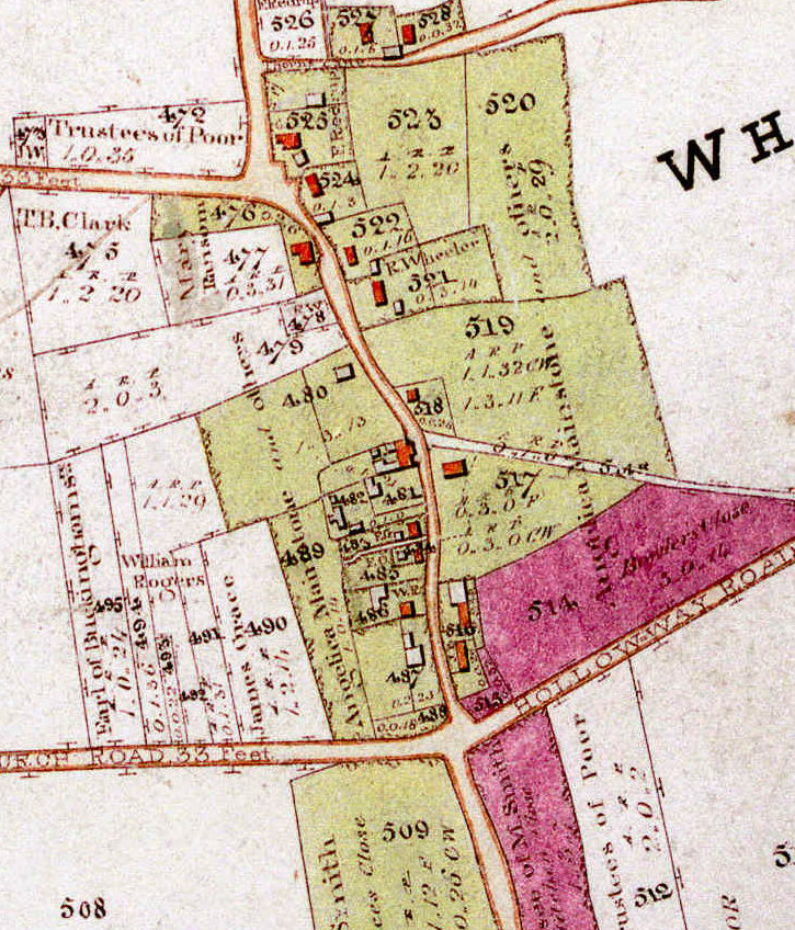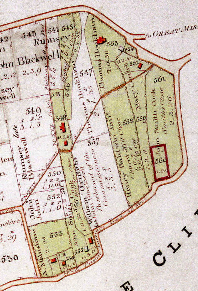 The 1839 Enclosure map showing all of White Cliff and Cadsden can be seen by clicking here. The centre of White Cliff is shown in detail in the map above and the few cottages of Cadsden are shown below. The current Holloway is marked as White Cliff Road and the current Peters Lane is shown as Church Road, running into Holloway Road. The old track of the Upper Icknield Way can be seen running across plots 517 and 519 (Whiteleaf House).