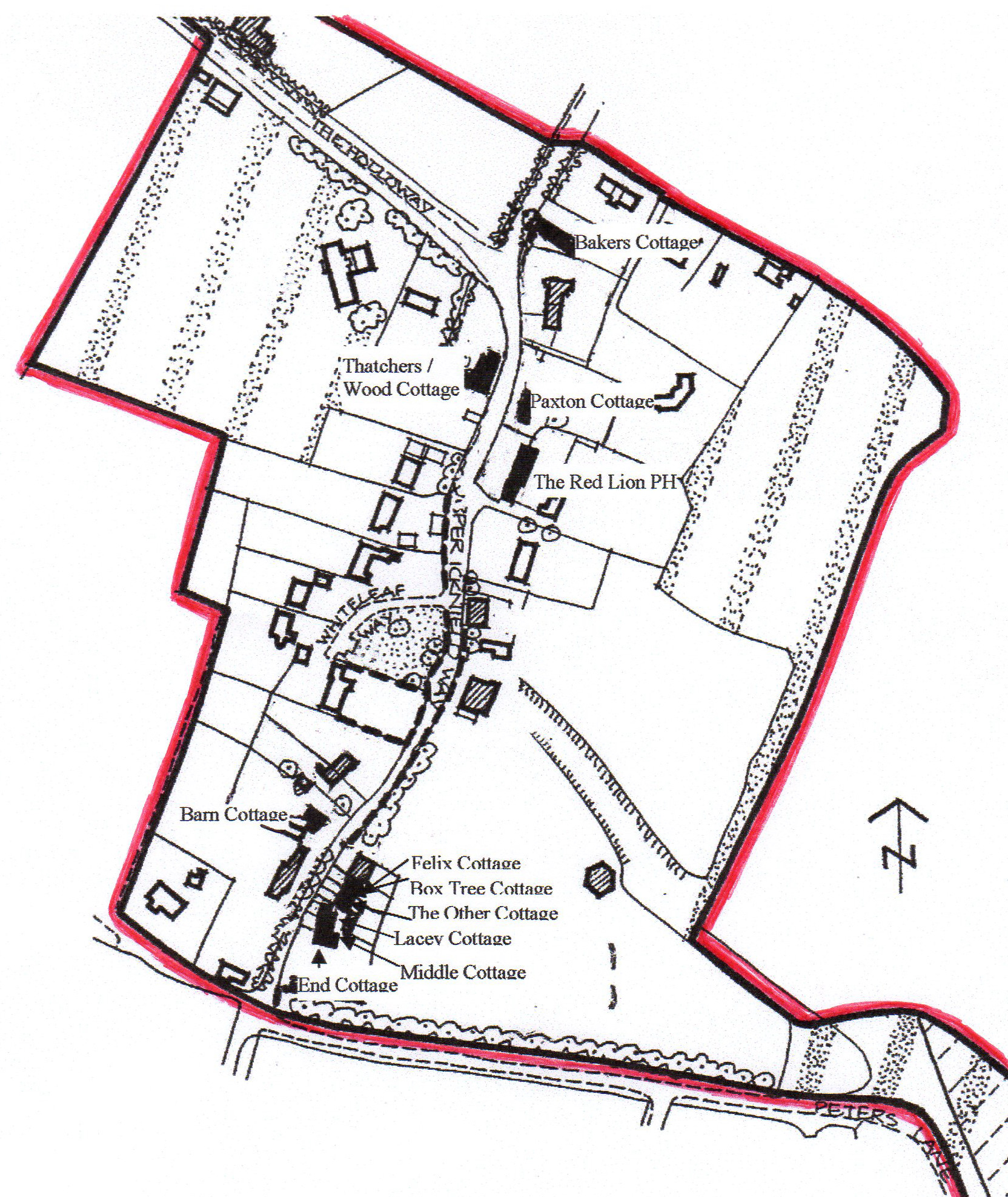 Whiteleaf was first designated as a conservation area in 1970. There are twelve listed dwellings in the conservation area, however the official list records only seven dwellings as the two terraces (comprising 6 houses) at the Peters Lane end of the Upper Icknield Way are listed as two items and Wood Cottage and Thatchers (which were in fact separate but are now one dwelling) are listed as one item. All the listings are grade II. A sketch of the conservation area is shown below, showing the listed buildings and outlining the boundary of the conservation area in red.The full Conservation Area Character Survey carried out by Wycombe District Council in 1996 can be accessed by clicking here.
