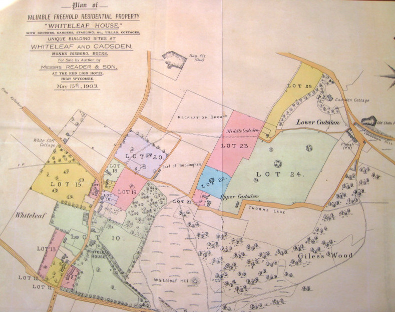 In 1832/4 Thomas Rogers Parsons moved to Princes Risborough (living in the Market Square before moving to Whiteleaf House) and set up the Lion Brewery in the town. On his death in 1878 his properties passed to his son, Thomas Parsons, who continued to acquire other properties and land within Whiteleaf and Cadsden until the Estate was sold in 1903. For the detailed sales prospectus click here.